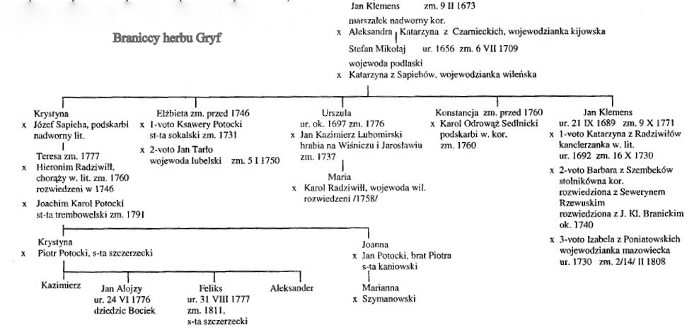Jeśli chodzi o prawnych spadkobierców po Janie Klemensie Branickim, to sytuacja była niezwykle skomplikowana. Ze względu na brak potomków dziedziczenie przypadało na jego cztery siostry – Krystynę, Elżbietę, Urszulę i Konstancję. W chwili śmierci kasztelana krakowskiego bezpotomnie zmarły, a więc nie były uwzględnione przy podziale majątku: Elżbieta i Konstancja. Jedynie Krystyna z Branickich Sapiehowa (zm. w 1761 r.) i Urszula z Branickich Lubomirska (zm. w 1776 r.) miały córki: odpowiednio Teresę (1715-1777) i Mariannę (1730-1795). Ostatnia była żoną Karola Radziwiłła, jednakże od roku 1758 była z nim rozwiedziona. Natomiast Teresa po unieważnieniu małżeństwa z Hieronimem Radziwiłłem w 1746 r. wzięła ślub z Joachimem Karolem Potockim, z którego związku urodziła się Krystyna (zm. 1789) oraz Joanna. W konsekwencji petentami do majątku zostali dzieci Krystyny i Piotra Franciszka Potockiego: Kazimierz (1773-1797), Jan Alojzy (1776-1854), Feliks (1777-1811) oraz Aleksander (1777-1777). Natomiast Joanna Potocka wyszła za mąż za Jana Potockiego, a z tego związku narodziła się Marianna Franciszka Tekla (1⁰ v. Szymanowska, 2⁰ v. Mostowska)[30].
